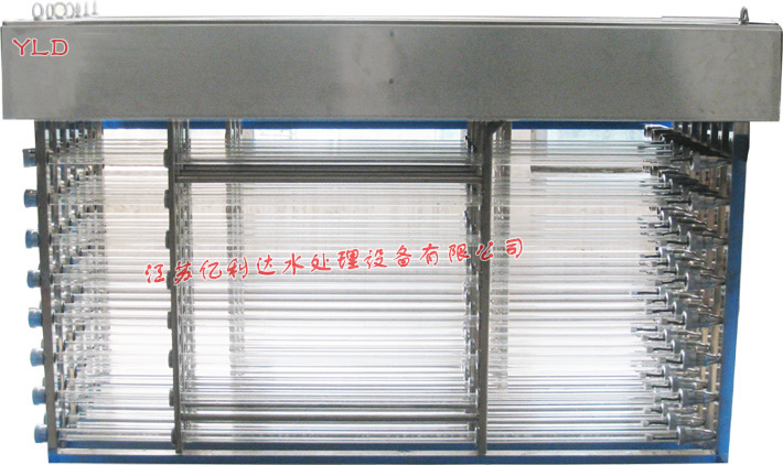 每個(gè)標(biāo)準(zhǔn)化紫外消毒模塊由一個(gè)不銹鋼燈架、紫外燈管、石英套管、配電系統(tǒng)及數(shù)據(jù)采集系統(tǒng)組成。