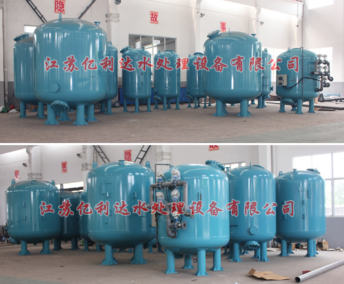 設備本體是帶上下橢圓封頭的圓柱形鋼結構,過濾器材質為Q235―A或304不銹鋼,內襯硫化橡膠防腐,內部在進水口設有布水器,下部設有集水裝置,集水裝置上填裝1200mm的活性碳和200mm的石英砂。成套設備的本體外部裝置有各種控制閥門和流量計、壓力表。