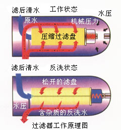 過濾盤片在彈簧力和水力作用下被緊密的壓在一起。但含有雜質(zhì)的水通過時,雜質(zhì)顆粒被截留。