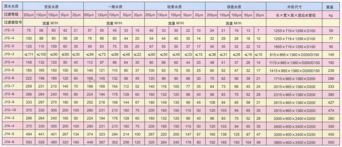 、很差水質(zhì):從很臟或富含鐵錳的井中抽取的井水,受洪水影響且未經(jīng)沉淀的地面水,未經(jīng)沉淀及生物處理的排水。為保證過濾系統(tǒng)較好的工作狀態(tài),D類水質(zhì)需要進行預處理以提高一個等級。
